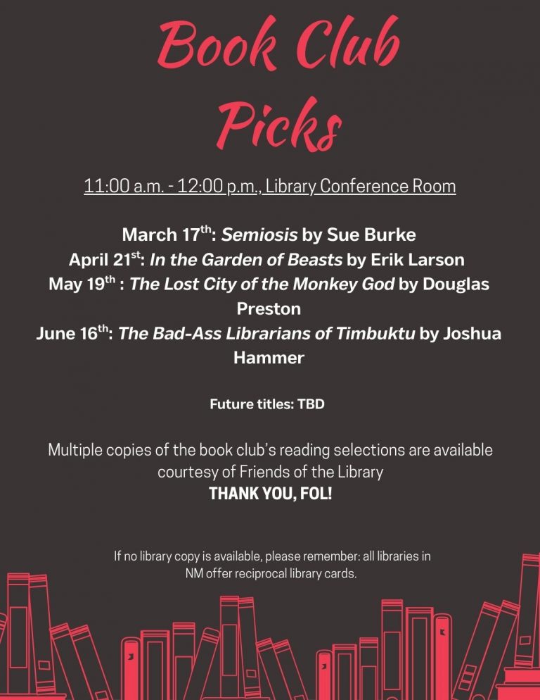 Services & Events Book ClubStorytime for Babes and TotsTai ChiCrafternoonsImprov @ the LibraryFriday FunHomeschool GroupPoetry ClubDodici Azpadu Writing WorkshopGarden Talks Mar.-Jun. 2026‘Primavera!’ Exhibit by Marla RobbBook ChatArt at the Library: Dustin Gutierrez’s Exhibit‘Playing for Change’ Music for PeaceTotal Body Conditioning & Deep StretchingDungeons & DragonsLibrary Card RenewalLinda Vozar Sweet Writing WorkshopCall for Local Artists