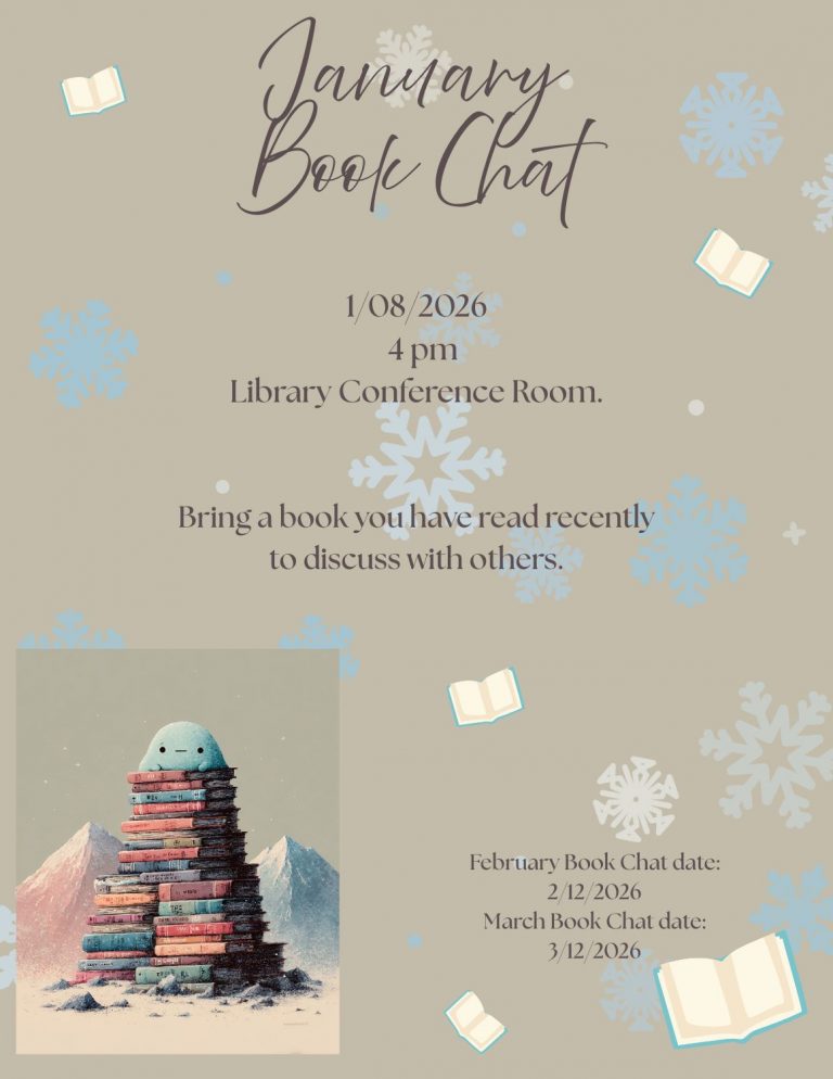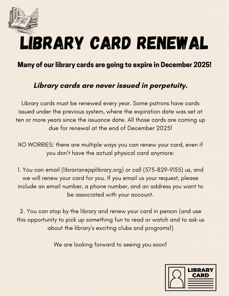 Services & Events Fall & Winter Library Closure DatesArt at the Library: Dustin Gutierrez’s ExhibitStorytime for Babes and TotsTai Chi at the LibraryBook ChatFriday FunHomeschool GroupBook ClubDodici Azpadu Writing WorkshopWriting Workshops, Jan.-Apr. and Jun.-Jul. 2026NEW! Improv @ the LibraryPoetry ClubLinda Vozar Sweet Writing WorkshopLibrary Card RenewalCall for Local ArtistsDungeons & Dragons