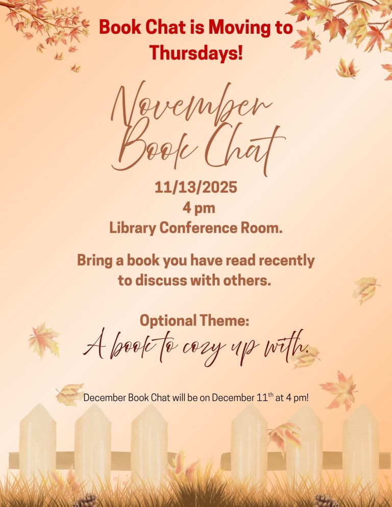Services & Events Library Card RenewalTai Chi at the LibraryFriday Fun: October EventsOctober Fun with Dot the Storyteller!Halloween Mini-Carnival at the LibraryLet’s Get Scared! Halloween Movie Night at the LibraryIntroduction to E-Resources: November 4, 2025Fall & Winter Library Closure DatesHomeschool GroupBook Chat: New Day & Time, Same Great Fun!Calling All Book Lovers! – New Book Club(s) Planning SessionOpen House Thank You Note and Upcoming New Clubs and EventsCall for Local ArtistsDungeons & DragonsBody ConditioningStorytime