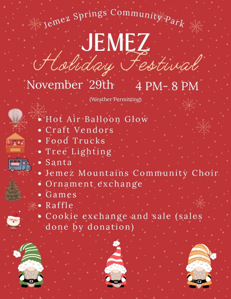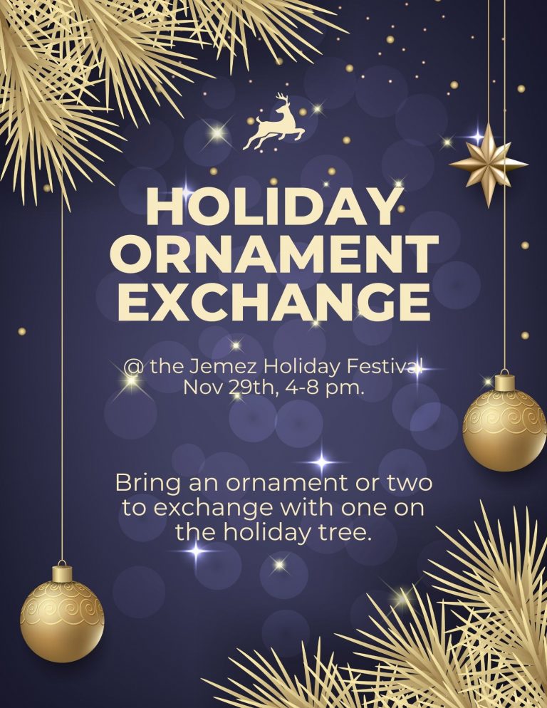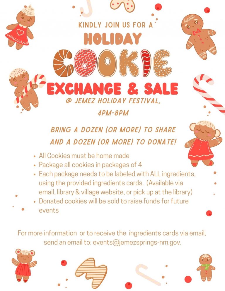 Services & Events Jemez Holiday FestivalJemez Holiday Festival: Cookie ExchangeJemez Holiday Festival: Ornament ExchangeNEW! Improv @ the LibraryNovember Friday FunHomeschool GroupBook Chat: New Day & Time, Same Great Fun!Calling All Book Lovers! – New Book Club(s) Planning SessionTai Chi at the LibraryFall & Winter Library Closure DatesLibrary Card RenewalCall for Local ArtistsDungeons & DragonsBody ConditioningStorytime