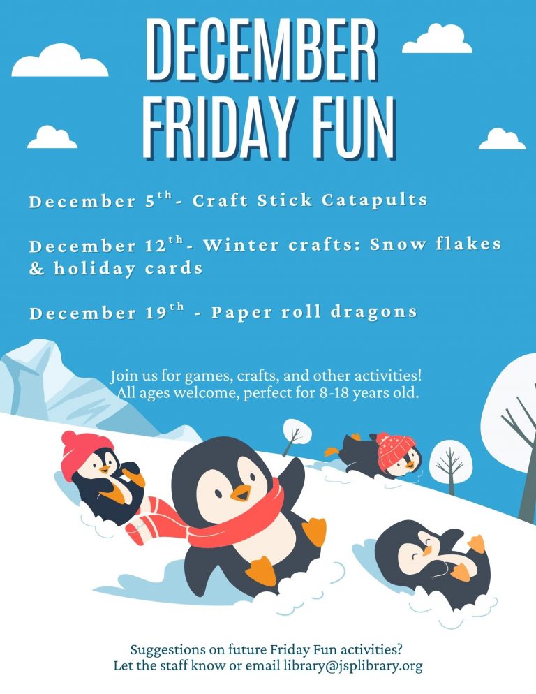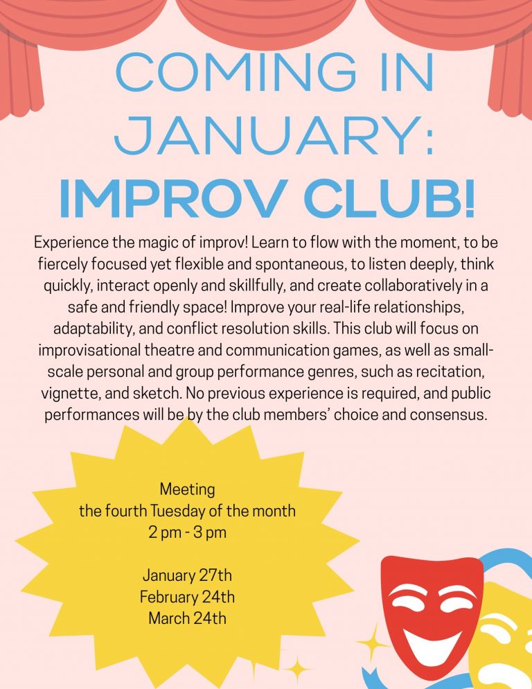 Services & Events Fall & Winter Library Closure DatesStorytime Special Guest: Dot the StorytellerTai Chi at the LibraryDecember Friday FunPoetry ClubNEW! Improv @ the LibraryHomeschool GroupBook ChatBook ClubLibrary Card RenewalCall for Local ArtistsDungeons & DragonsBody ConditioningStorytimeBusiness Resources