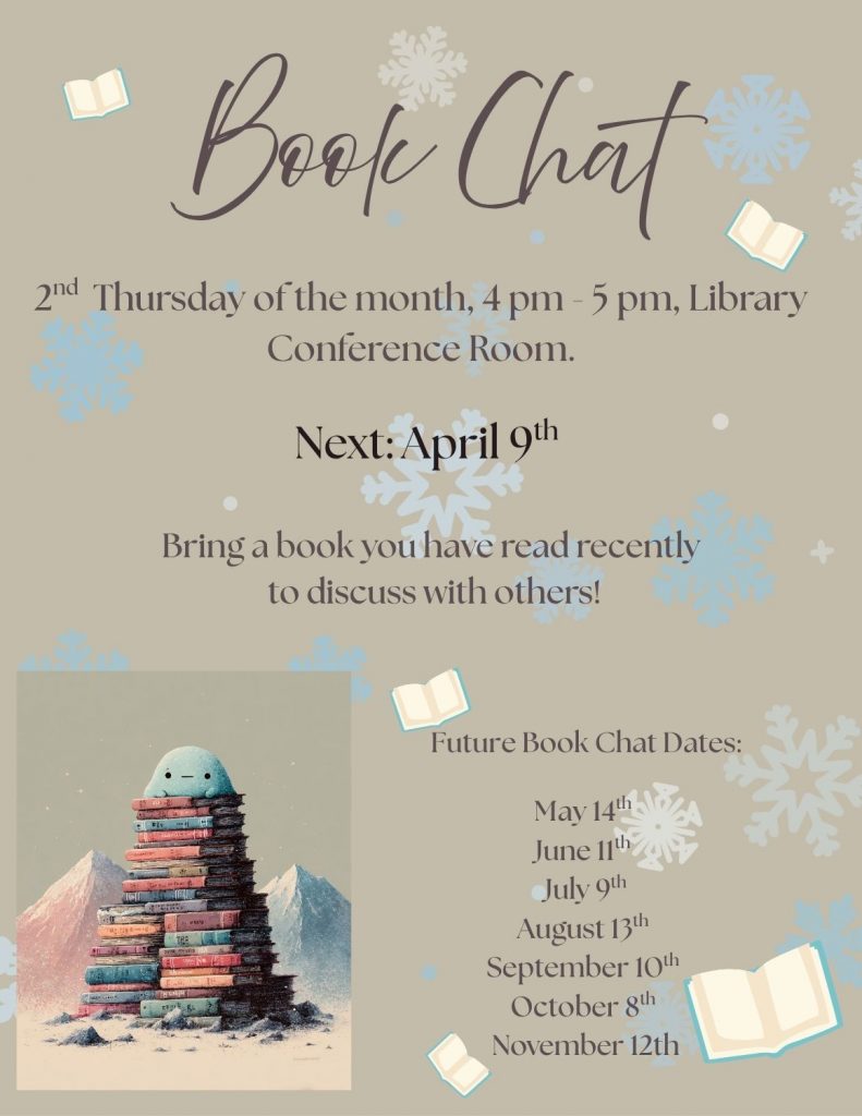 2nd Thursday of the month, 4 pm, Library Conference Room.