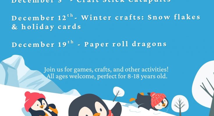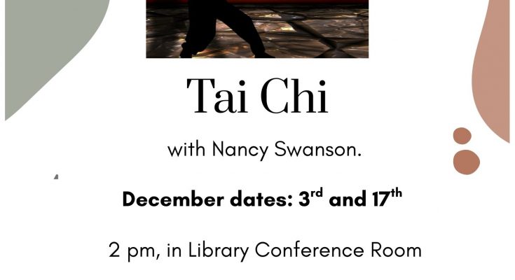 Tai-Chi with Nancy Swanson, 1st, 3rd, and 5th (when applicable) Wednesday of the month, 2 pm, Library Conference Room or Father Fitzgerald Park (depending on the weather). Next meetings: December 3rd, December 17th, January 7th, January 21st, 2 pm. Adults & teens age 15+. NOTE: No meeting on December 31st. Enjoy your New Year’s Eve!