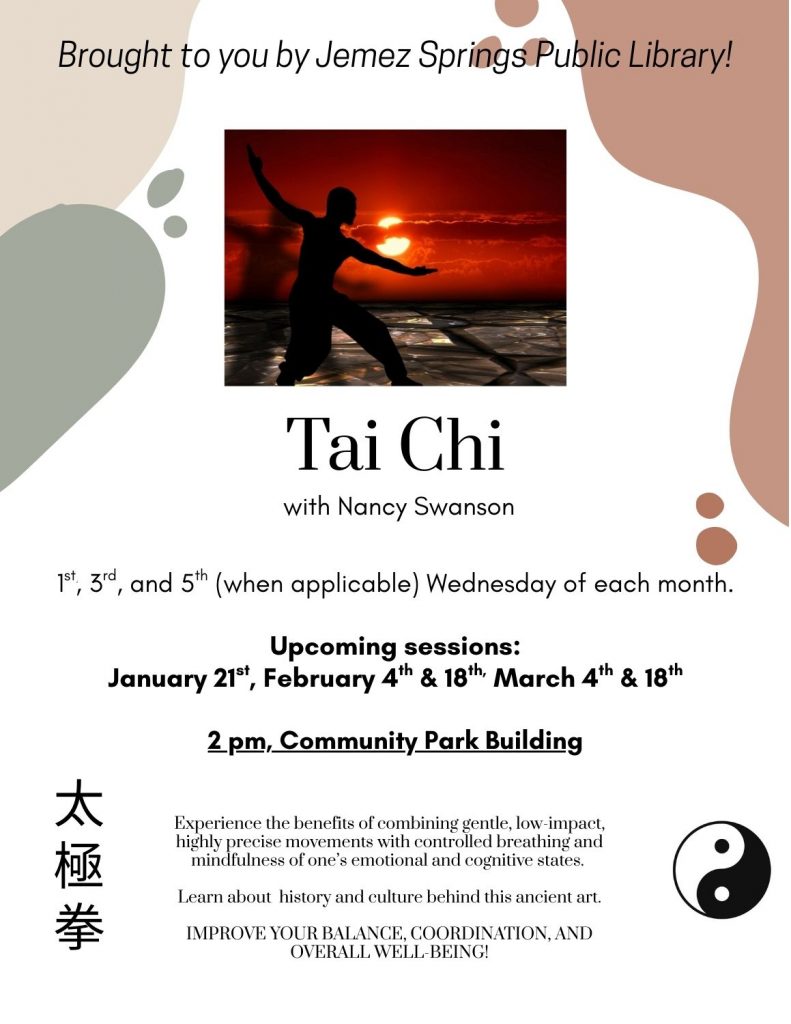 Tai-Chi with Nancy Swanson, 1st, 3rd, and 5th (when applicable) Wednesday of the month, 2 pm – 3 pm, at the Community Park Building. Adults & teens age 15+.