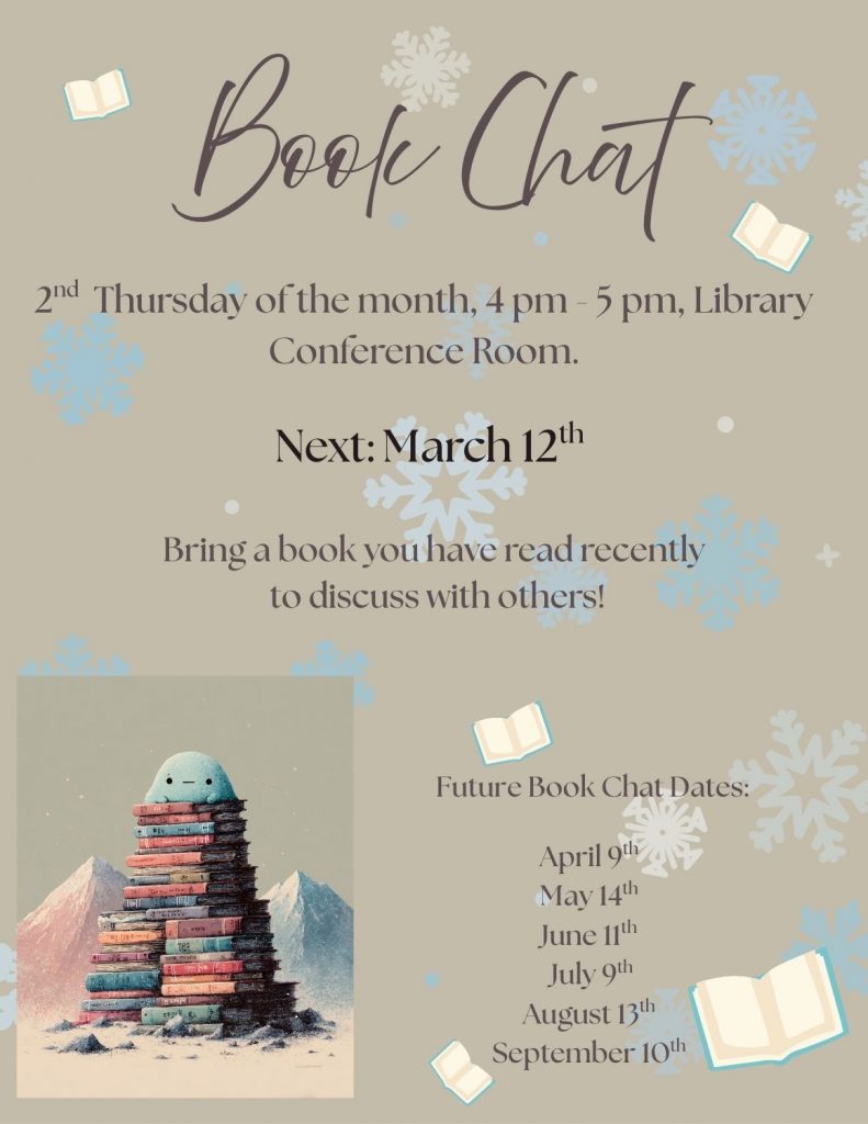 2nd Thursday of the month, 4 pm, Library Conference Room.