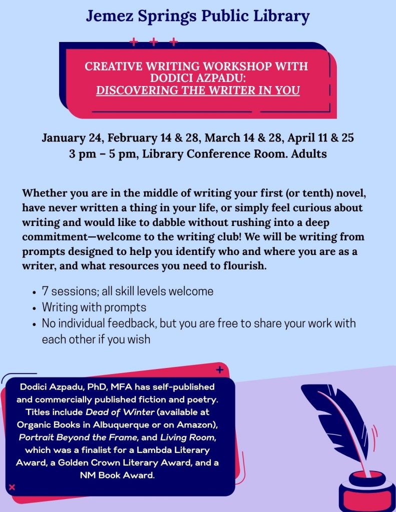 2nd and 4th Saturday of the month, starting January 24: January 24, February 14 & 28, March 14 & 28, April 11 & 25. 3 p.m. – 5 p.m. Library Conference Room.