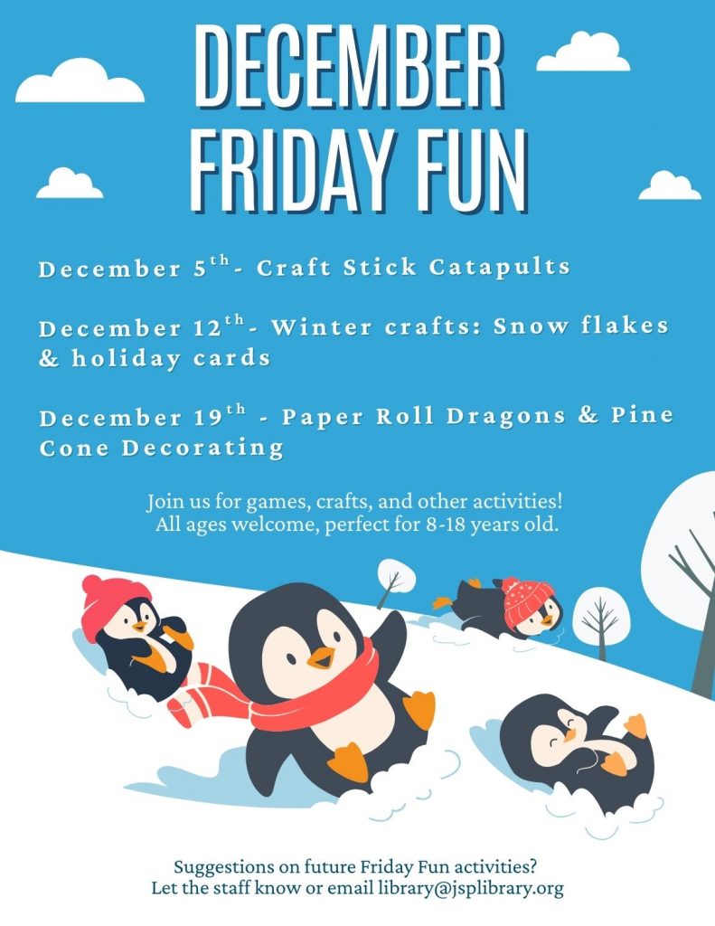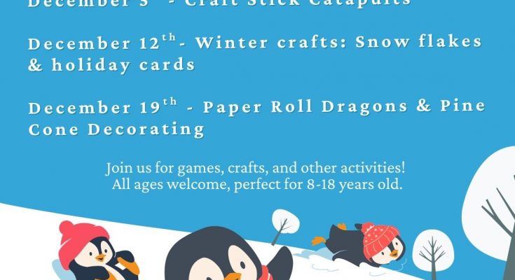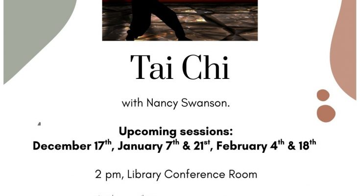 Tai-Chi with Nancy Swanson, 1st, 3rd, and 5th (when applicable) Wednesday of the month, 2 pm. Next meetings: December 17th, January 7th and 21st, February 4th and 18th, 2 pm. Adults & teens age 15+. NOTE: No meeting on December 31st. Enjoy your New Year’s Eve!